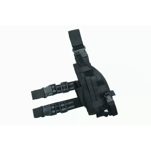 The Shadow Strategic Drop Leg Universal Pistol Holster has a quick release pistol-grip strap for extra retention. A single pistol mag pouch on the front with adjustable flap for large cap mags, the holster attaches to the belt via an adjustable extender with fastex buckle, and to the leg with two adjustable Nylon straps with anti slip bands and fastex buckles. The extender and the leg straps may be removed in order to attach the holster directly to the belt.