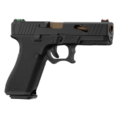 The ATP 03 replica uses a gas blowback system that replicates the recoil and semi-automatic cycle of a real firearm. Its grooved and ported metal slide provides an aggressive look, while the bronze outer barrel enhances both its aesthetics and durability against the elements.